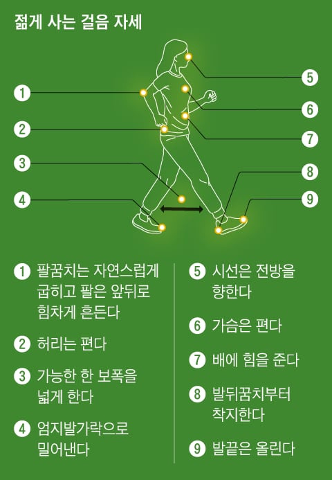 활기찬 걸음으로 노화 예방을 하려면은 1. 걸을 때 허리와 가슴을 펴고, 2. 배에 힘주며, 3. 시선은 정방향을 향하고, 4. 팔꿈치는 자연스럽게 굽히고  5. 팔은 앞뒤로 힘들게 흔들고, 6. 가능한 보폭을 넓게 하고 7. 발끝을 올리며 8. 발뒤꿈치 먼저 착지하고 나갈 때 엄지발가락으로 지면을 밀어내며 걸어야 합니다