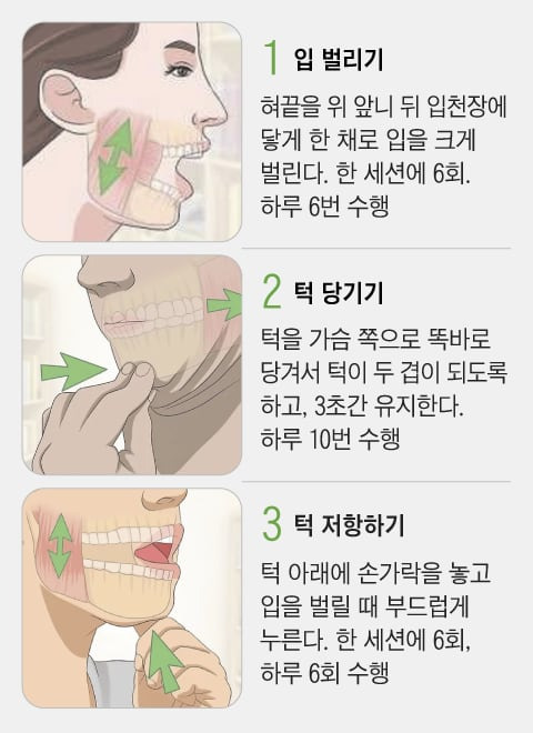 턱관절 사이에는 연골 디스크가 있어서 움직임을 부드럽게 하는데 나이가 들면 연골이 점차 닳고 탄력을 잃으며 이는 마치 무릎의 퇴행성 관절염 변화와 같으며 턱 주변 근육과 인대도 약해져 관절을 안정적으로 지탱하는 능력도 떨어진다고 합니다 턱관절강화 운동과 저작근 스트레칭에 대해서 알아보겠습니다